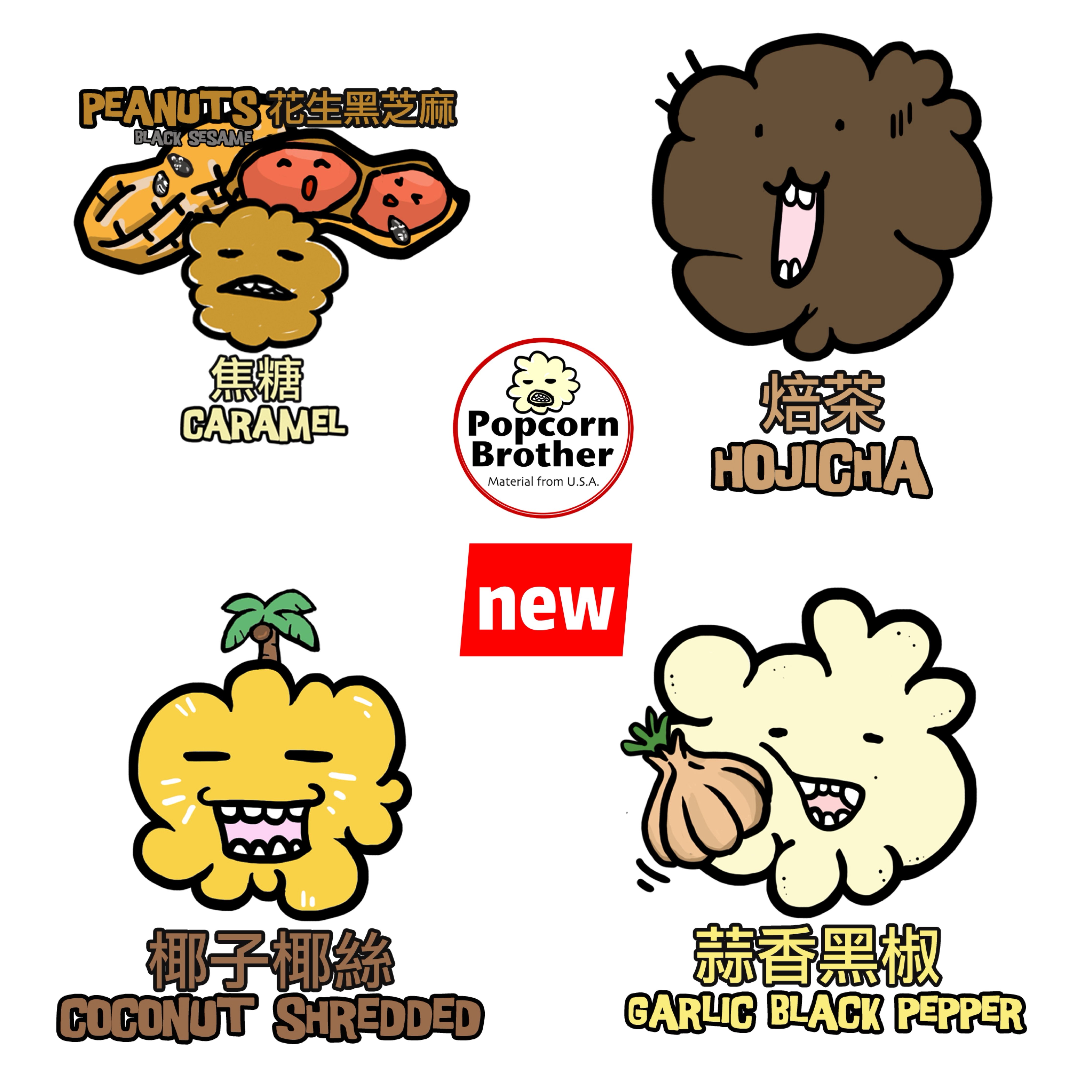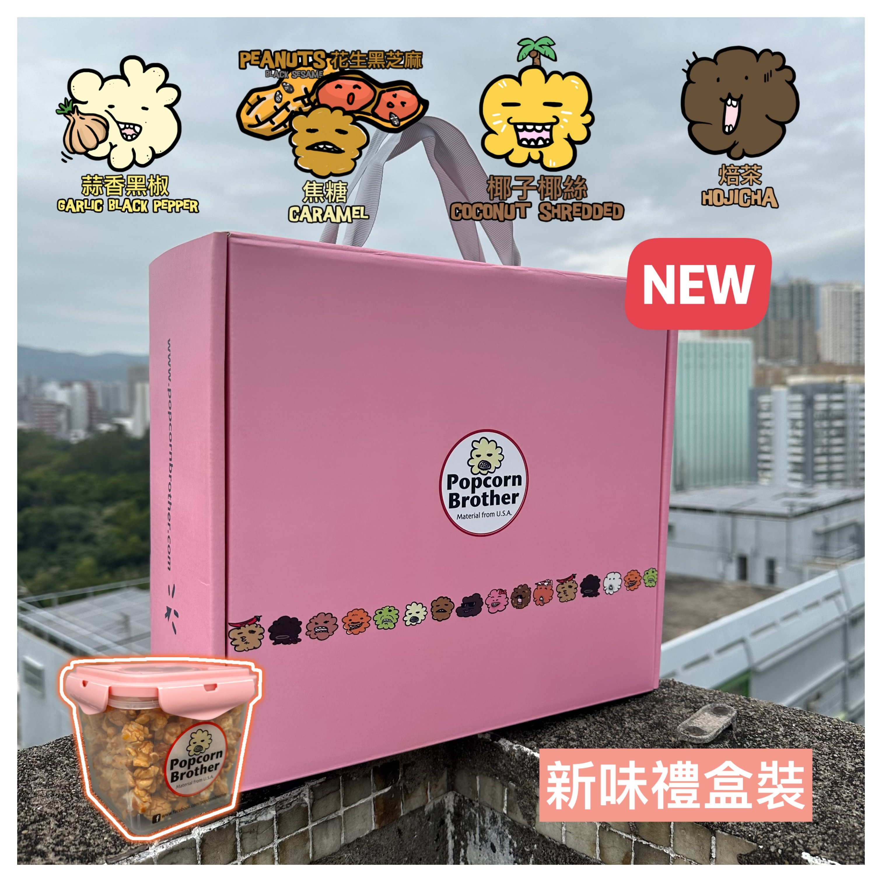 新味禮盒裝:蒜香黑椒、花生黑芝麻、椰子椰絲、焙茶味+粉紅色蓋